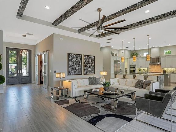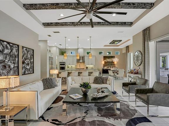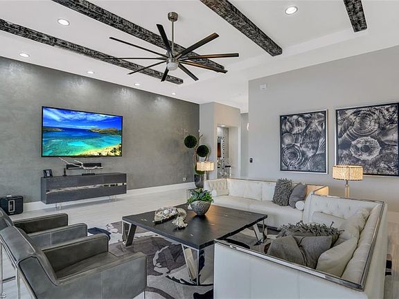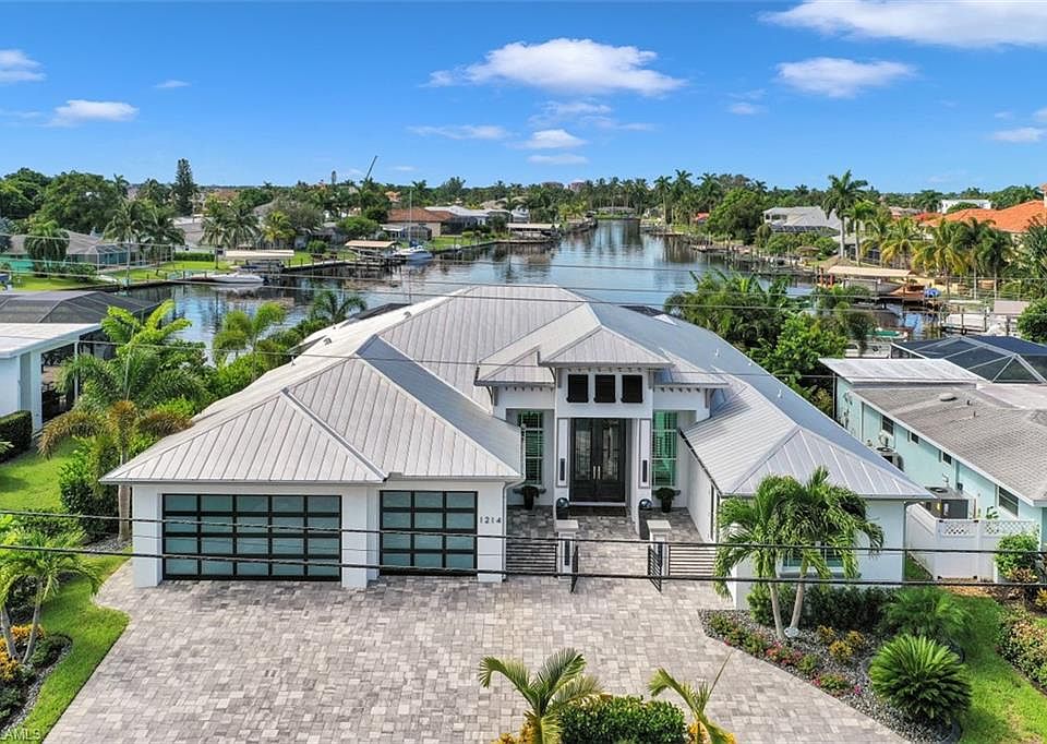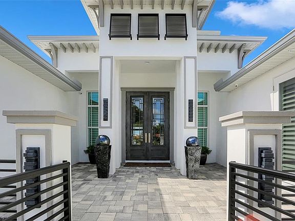 In Cape Coral its all about the water and this magnificent home embodies all the best in waterfront living the Cape has to offer. Direct access - no bridges, no lock - on a wide basin with outstanding water views, Yacht Club neighborhood, southern exposure and just two minutes to the river. Approaching the home youll appreciate the circular drive and distinctive Miami Dade rated glass doors on the 3 car garage. Soft contemporary style home features 3014 sq ft, open floor plan, 4 bedrooms including a sumptuous master suite and one junior master suite, 3 baths, a foodies kitchen w/ 2 large quartz islands, fresh white cabinets, gas cooktop, SS appliances, wine cooler, and huge walk-in pantry. Make the most of Florida outdoor living on the sprawling, screened, travertine lanai w/ gas fireplace, covered outdoor kitchen, large saltwater pool with jet water features, sun shelf & integrated infinity edge spa. You and your boat will love the 1000+ sq ft composite dock w/ 27k lb lift & 42 ft slip highlighted by black marine rope with SS rope hooks and 3 underwater fish lights. Truly move-in ready the home shows like a model, and most of the upmarket furniture & accessories are included.