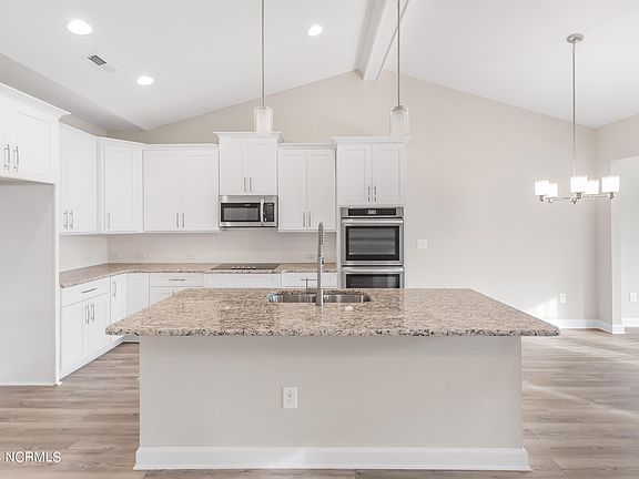 Brand NEW, move-in ready, low maintenance, brick home in the gated community of Palmetto Creek. Walk inside the Clairmont from Caviness and Cates and you will immediately notice the stunning wainscoting and two-piece crown molding detail in the foyer. The open kitchen and dining area showcases a large center island, timeless white cabinets, ''Santa Cecila Light'' granite countertops and white subway tile backsplash. Additional features include stainless double wall ovens and smooth top cooktop with built-in microwave. Enjoy entertaining in the large great room with cathedral ceilings with wood beam detail and cozy gas fireplace. The Carolina Room is the perfect place to enjoy your morning coffee while looking into your backyard with covered porch. The 1st floor primary suite includes a tray ceiling with crown molding, a spacious walk-in closet with custom wood shelving. Step inside the spa-like bath with tile flooring, double sink vanities with quartz countertops, 6-foot fully tiled zero-threshold walk-in shower with seat, private water closet and a linen closet. Two additional bedrooms share hall access to a full bathroom with tile flooring, vanity with white shaker cabinets and Quartz countertops, and bathtub/shower with tile surround. Just off the two-car garage, the mudroom includes built-in coat station with bench and cubbies, washer/dryer connections, and linen closet. Additional features in this home include LVP flooring in the foyer, great room, kitchen, breakfast area and Carolina room, gutters, sodded yard with irrigation system, and in-house builder warranty for added peace of mind. Enjoy nearby Oak Island and Holden beach as well as all of the amenities ready for your enjoyment TODAY - clubhouse with resort-style pool, fully equipped fitness center, trails, tennis courts, putting green, meandering ponds and lakes, along with a kayak and canoe launch. Don't miss out on this great opportunity to own in Palmetto Creek.