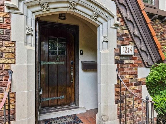 You enter the house through a gorgeous original wood front door into the entryway with curved doorways, original tile floor and a coat closet. The large living room and dining room adjacent to the entry are perfect for family and entertaining. The living room has a gorgeous wood burning fireplace with a carved wood mantel and stone surround, vaulted ceiling, wood floor and many windows. French doors lead you into a sunroom with built-in bookshelves. (See Supplement for more information)