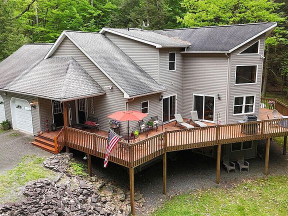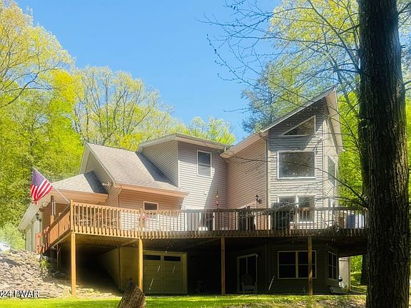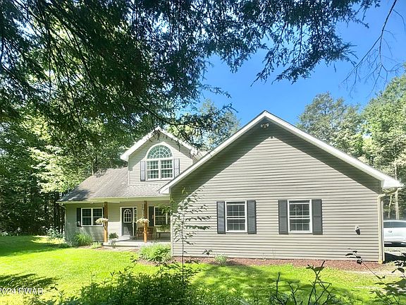 STUNNING WATERFRONT CUSTOM HOME on 3.68 acres with a two car attached garage with radiant floor heating, cathedral ceilings, and a bright open floor plan. Walk into the spacious eat in kitchen with stainless steel appliances and granite countertops. NEW wood floors flow into the spacious family room with a stone propane fireplace and floor to ceiling windows. The primary bedroom suite is situated on the main level for convenience with a full bathroom, dual head shower, and walk-in closet. Enjoy the holidays in the formal dining room or during the warmer months, right off the kitchen through the sliding glass doors on to the expansive wrap around deck. Upstairs you will find two bedrooms, a full bathroom and a comfortable loft/office overlooking the family room. The walk-in attic could be easily finished for more living space if desired. Radiant floor heating throughout the main level and basement floor, along with ductless air conditioning/heat pump, and a new furnace make this home VERY comfortable any time of the year. The possibilities are endless in the full walk out basement with plumbing already in place for an additional bathroom, and full size windows and glass doors leading out towards the lake. Bring your kayaks, quads, side-by-sides conveniently through the third garage door in the basement, or perfect for a workshop area! Enjoy the privacy walking down through the wooded backyard that opens up to a private lake for fishing, kayaking or just relaxing by the water. Located only 15 minutes from Lake Wallenpaupack, 45 minutes to skiing and 10 minutes to schools, shopping and restaurants. This unique property is a MUST SEE! Seller is related to listing agent.