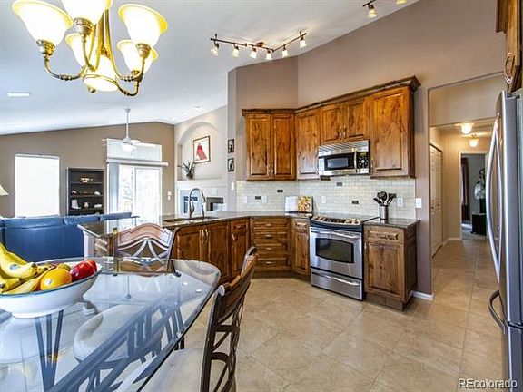 Wonderfully updated ranch style home located in the Red Hawk Golf Community. This 5 Bedroom, 3 Bath home is situated backing to open space and a walking trail. The beautiful kitchen features slab granite countertops, 42" knotty alder cabinets, custom tile backsplash, stainless steel appliances, tile floors and breakfast bar. Located off the kitchen is the formal dining and living room. The kitchen nook area opens to the family room with a gas fireplace. Spacious Master Bedroom with vaulted ceilings, spa-like 5-piece Master Bath with jetted tub and walk-in closet. The finished basement boasts a recreation room with bar, theater/media room, 2 more bedrooms and a full bath. Heated 3-car garage has plenty of space. A/C for those hot days. Newer exterior paint and newer furnace. LOW tax rate. Easy access to I-25 and close to downtown Castle Rock, The MAC (Phillip S Miller Park) and Golf Course. Don't miss this one!