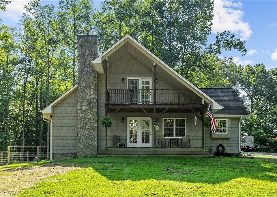 Discover your dream home in Traphill! This stunning 3-bedroom, 2-bath chalet-style retreat sits on approximately 9.8 acres with a winding creek and abundant wildlife. Closely situated to Stone Mountain State Park and Greenstreet Mountain Resort and Golf Course. Upgrades throughout. Granite countertops, wood cabinets, stainless steel appliances, smooth ceilings, and hardwood and tile floors. The open floor plan includes a cozy fireplace in the living room, and the main level hosts the primary bedroom and laundry. Enjoy balcony access from both the main level and upstairs bedroom. Relax on any of the four porches or work on projects in the 24x24 metal detached garage with a concrete floor and 220 power. This property is a rare find—don't miss out! Deeded Right of way across portion of driveway.