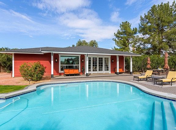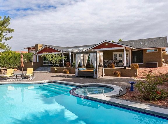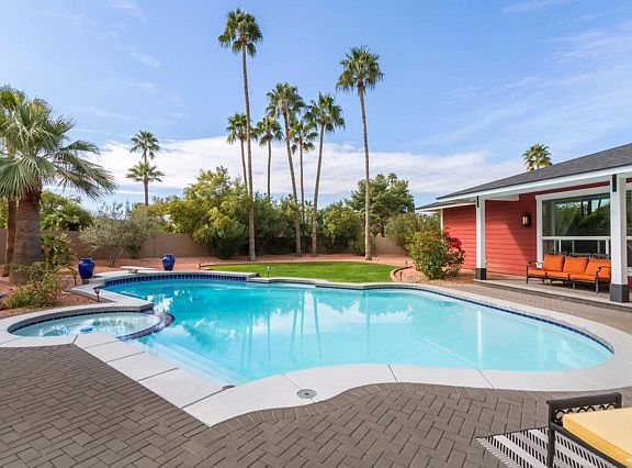 Step outside to a true resort-style backyard, complete with a large covered patio, built-in BBQ, pool, spa, and lush grass area ideal for outdoor dining, entertaining, or relaxing under the Arizona sun.