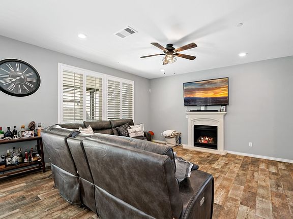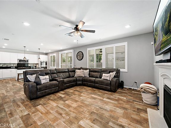 Welcome to your dream home!! This stunning 4-bedroom, 2.5-bath beauty has it all. From the moment you step inside, you'll be greeted by upgraded flooring and raised panel doors that exude elegance. The modern kitchen is a chef's delight, featuring sleek quartz countertops, an island with an oversized stainless steel sink, double oven, 5-burner cooktop, microwave, dishwasher, walk in pantry and a refrigerator – all included! There are shutters on the windows and recessed lighting throughout. Upstairs you will enjoy a spacious master suite as your personal retreat and it's complete with a large soaking tub, a separate glass walk-in shower, and a generously sized walk-in closet. The loft area is perfect for an office, family retreat, or cozy relaxation spot and the front balcony is the ideal space to enjoy your morning coffee. Step outside to an expansive backyard, where a large Alumawood patio cover offers shade and comfort. The side yard is perfect as a play area or dog run and with a larger-than-average lot, there's plenty of space for the whole family to enjoy. This home offers a perfect blend of luxury and functionality – don't miss seeing this one today!