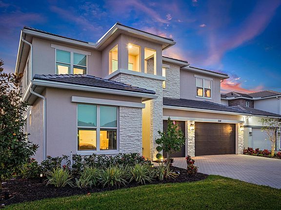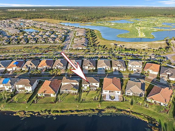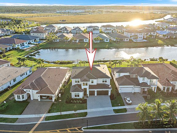 Better-than-New, 2023-built MODERN ARCHITECTURAL DREAM with major wow-factor throughout. Move right into this this model-perfect 5BR/4.5BA + Office + Loft featuring a spacious THREE-CAR-GARAGE and prime location in the prestigious gated community, La Terre at Avenir in Palm Beach Gardens. This contemporary home is loaded with designer upgrades and situated on a premium lot with 80 FEET OF WATER FRONTAGE. Enjoy a versatile floor plan to fit your family's needs from this light and bright lake-front property. Luxurious contemporary finishes throughout, accentuated with modern designer light fixtures, upscale touches, and useful upgrades. 24 x 24 porcelain tile throughout the first floor, with handsome, rich wood flooring upstairs. Stunning RH light fixtures above kitchen island and chandelier in foyer.