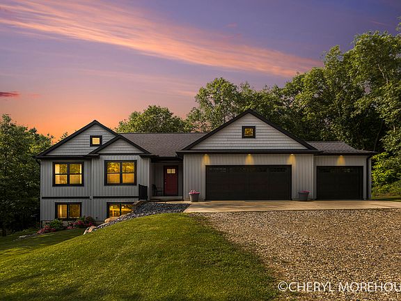 This 2017 walkout ranch home offers privacy and tranquility on 3.107 wooded acres. The main level features a spacious open floor plan, seamlessly connecting the great room, dining area, and kitchen. The kitchen is a chef's dream, boasting quartz counters, a tile backsplash, a center island, abundant cabinetry, and pantry. The great room is enhanced with a beautiful gas fireplace framed by windows on either side. Primary Suite offering trey ceilings and natural lighting. Guest bath, Two additional bedrooms, full bath and laundry room complete the main level living space. Custom built-ins throughout! The lower walkout level is a favorite, with a large family room featuring custom built-ins, two additional bedrooms, and a full bath. Entertaining is effortless with a maintenance-free deck as well as a stairway down to the lower level patio, complete with a firepit. Anderson windows, spectrum internet, and a three-stall garage with wall heater. Despite its serene setting, the home is located just minutes from modern conveniences.