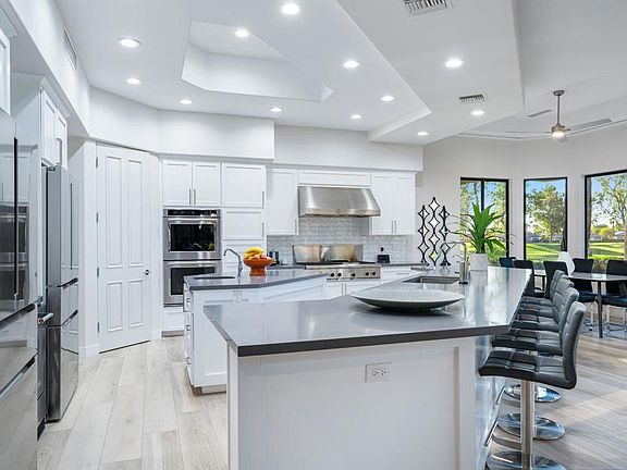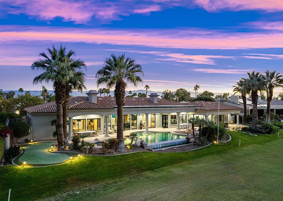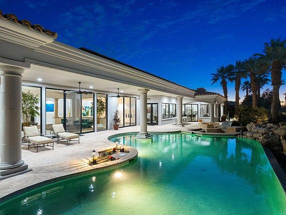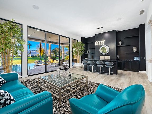 Stunning South Facing Estate with Renovated Stylish Contemporary Interiors and Amazing Mountain and Arnold Palmer Course Views. Circular Drive with Porte Cochere and water features provide a grand arrival to the property. Double doors lead to an entry hall and great entertaining space with seating area, large entertainer's bar and dining room all with walls of glass and sliders framing the spectacular views to the infinity pool, double fairways and mountains. An Open Great Room and Gourmet Chef's Kitchen provide extensive space for everyday living. Great Room features fireplace and pass through bar. Social Kitchen has high end stainless appliances, island with prep sink, counter seating and an informal dining area with those mountain and golf views. Primary Suite features a sitting area with views, double spa baths and walk-in closets, including space for a gym. A 2 room guest suite in the house, an attached guest house with fireplace and private terrace and an office provide great space for family and friends. Outside is your own resort including infinity pool and spa with waterfall and swim up bar, water features, built-in bbq, firepit, putting green and covered outdoor dining and living all overlooking the south and west mountains and #9 and #5 of the Palmer Course. Recent Renovation of all interiors with stylish contemporary/transitional finishes. Solar Equipped and a hard to find 4 car garage. Move in ready - Come home to your own private desert estate!