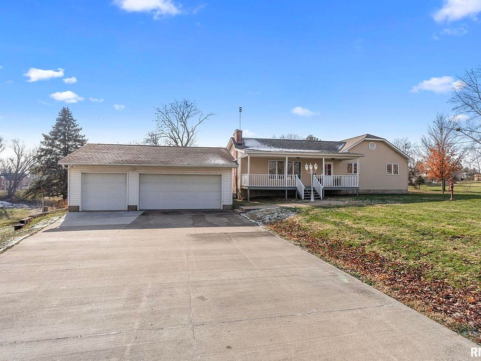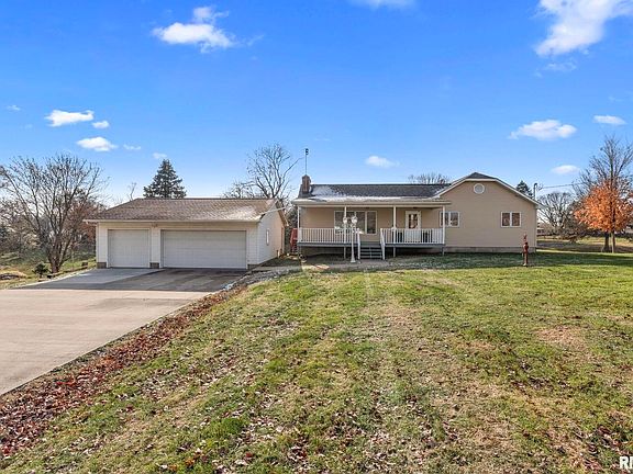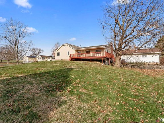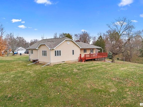 Welcome to this stunning ranch home set on a breathtaking 2.8 acres. This property showcases a beautiful wrap-around deck that offers stunning views of the serine landscape as well as a large covered front porch. Fully renovated in 1994 including being lifted up & having a poured basement added with a walkout. A poured basement not only provides durability & strength but adds energy efficiency. Behind those basement walls is 1" Styrofoam to enhance efficiency. This meticulously updated residence features new wiring & plumbing. The home offers 3 spacious bedrooms & 2 well appointed full bathrooms, along with a half bath located in the basement. During the renovation an additional 375 sq.ft. was added to create a dining room & kitchen area. The kitchen boasts stainless steel appliances & Corian countertops. PELLA windows throughout, all feature interior blinds & the gleaming hardwood floors showcase the term 'Pride of Homeownership' All appliances stay making this gem truly move-in ready! PER SELLER: Roof on home 22', Roof on garage 18', Water Heater 20', Furnace 18' Whether you're looking for a peaceful retreat or a property with room to grow, this home combines modern convenience with expansive outdoor living.