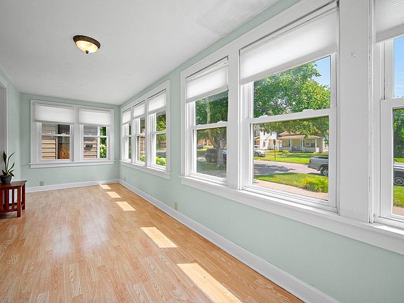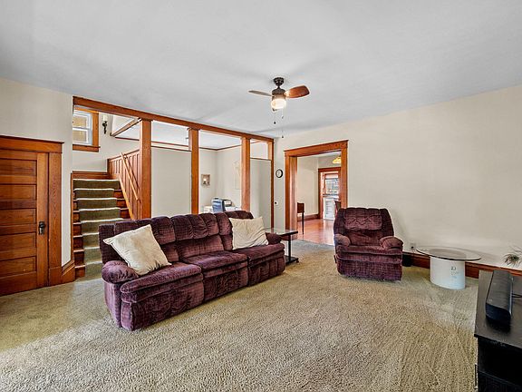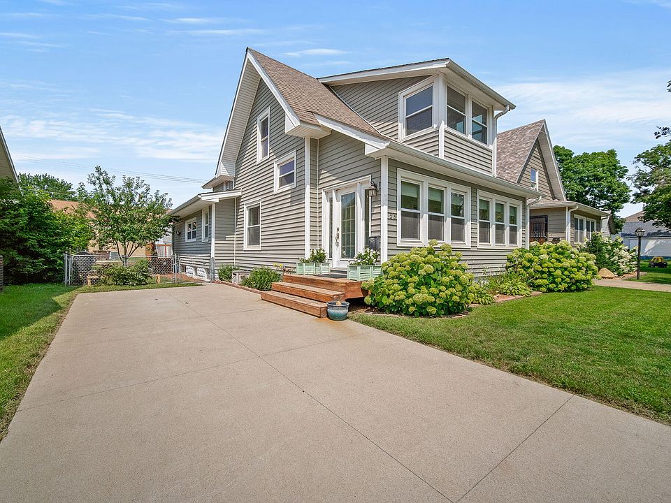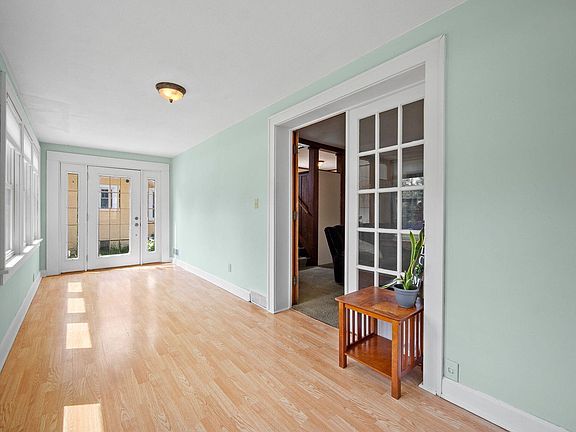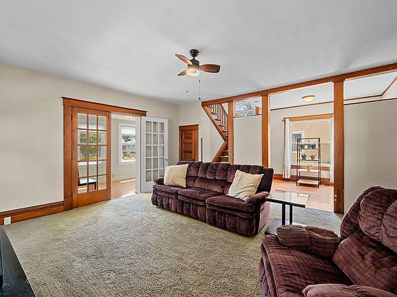 This spacious two-story home offers all the room you need while blending modern updates with authentic 1920s character and charm. The welcoming front porch is the perfect place for backpacks, shoes, and coats. Inside, the living room features high ceilings, wide baseboard trim, a wood-paneled home office, and a hidden pocket door leading to the dining room. The kitchen includes warm wood cabinets, stainless steel appliances, and a gas range. Just off the kitchen, you will find a built-in pantry, convenient main floor laundry, and an updated bathroom with a shower. Upstairs, there are three nicely sized bedrooms with five-panel solid wood doors. For a bit of privacy, relax in the upstairs bath with a jetted tub, or read a book in the reading nook with views of the tree-lined street outside. Outside, you will enjoy easy maintenance with updated vinyl windows and siding. A large deck overlooks the fenced yard, tasteful landscaping, a charming apple tree, and a detached garage. Located in a quiet residential neighborhood within walking distance to downtown.