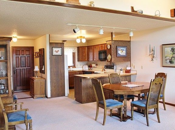 1215 Country Club Drive Two bedroom townhome located on the No. 10 Fairway with spectacular view of Spearfish Canyon and Crow Peak. Walk into this well taken care of home and you will notice the windows frame the Black Hills and Spearfish Canyon Golf Course. Open floor plan with vaulted ceiling, spacious deck and built in office area. The second bedroom has the option to be opened up or closed off when you have guest stay. The heated two stall garage is finished with additional storage. The HOA makes living here easy as it covers the maintenance the immaculate grounds, outside building maintenance, snow removal, garbage service, water and exterior insurance. $198,000. MLS #48339