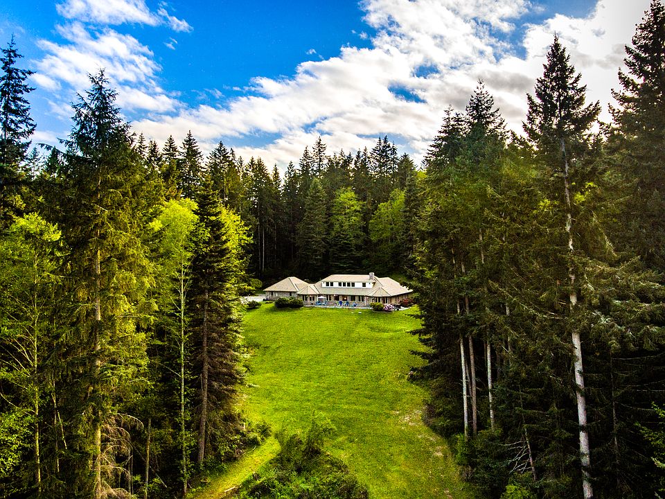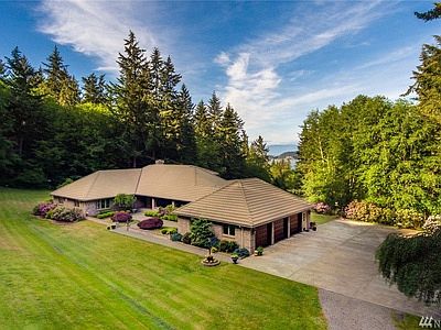 Whidbey Island estate perfectly sited on over 11 acres framed by evergreens and private trails with views of Mt. Baker & Skagit Bay. Uncompromising quality custom built by Yonkman. Chef's kitchen, main level master and two additional en suite guest rooms, one with private sitting room. Bonus room with 2nd kitchen. Aggregate patios, brick exterior, cement tile roof, 3-car garage, and room in basement to expand. Close to Deception Pass and Dugualla State Parks for beach access! Tranquility awaits!