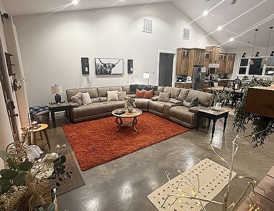 Vaulted living area with 10-foot ceilings and 8-foot doors throughout