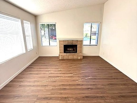 This centrally located residence boasts three generously sized bedrooms, each adorned with plush new carpeting for your comfort. The home's design is light and airy, featuring a step-down living room, complete with a fireplace. The large kitchen offering abundant cabinetry, full-size pantry and a kitchen nook for cozy dining. New wood-like flooring adds a touch of elegance to the home. The attached two-car garage comes with an opener and washer/dryer hook-ups for your convenience. Outside, you'll find a large, low-maintenance patio, ideal for outdoor entertaining. Common area pool and tennis courts are located nearby