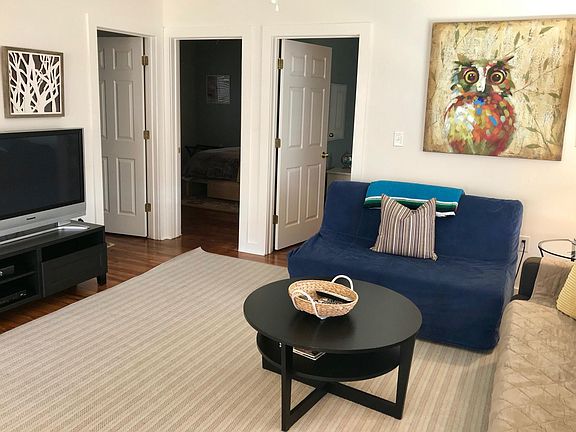 FULLY FURNISHED! I am the owner of this property. This apartment is available on September 24th, 2024 3-6 months or 1 year rental All the utilities and 2 parking spots are included. You will love to come back home to this second floor apartment with open, spacious floor plan. Big windows offer lots of light and town views. Kitchen with big island, such an inviting space to have a friend over for dinner or for take out. There are pots and pans to make a meal if you like to cook, Keurig coffee maker and the toaster, besides the stove, refrigerator and the microwave oven. There is a little deck to sit outside, relaxing, when the weather permits to watch the busy life on the street below. There are 2 bedrooms. Each has a very comfortable hotel quality queen size bed and a luscious bedding. Roomy closet and the dresser will fit your belongings. The bathroom has a tub shower with glass door, so nice to take a hot shower after work. There are plenty of soft towels. The whole apartment has good window covering to create low lighting if you need to take nap during the day. If you like to dine out, there are 5 restaurants on our street and 2 others very close by, all walking distance if you like to walk. We are allowing one dog and one cat. Owner pays for sewer and water, electricity and internet.