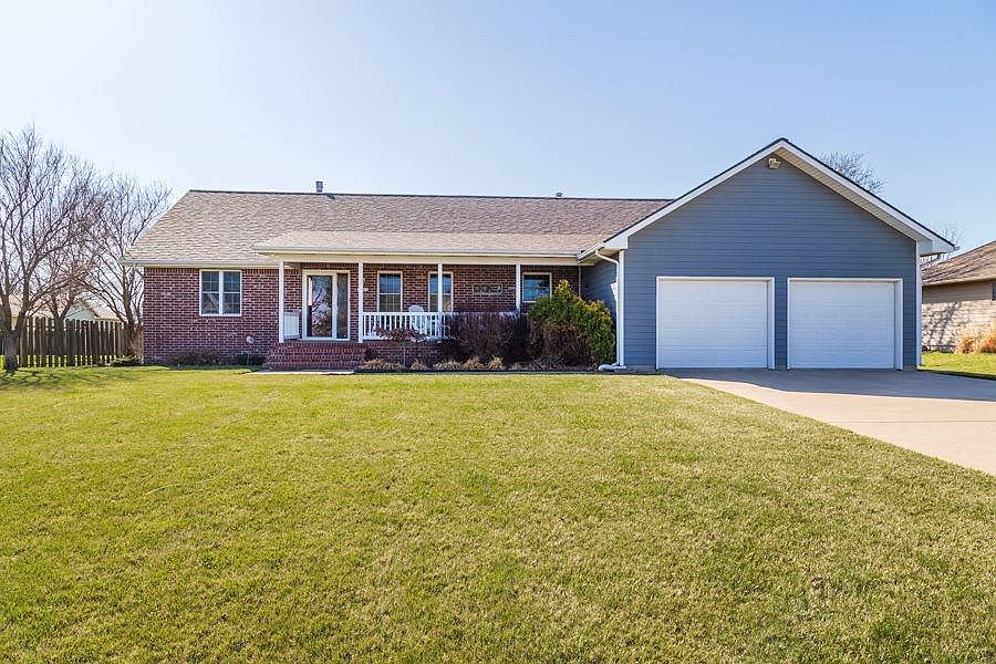 Fantastic custom built home in the desirable Cedar Meadows subdivision. Located in Halstead, centrally located between Wichita, Newton and Hutchinson. Enjoy your morning coffee or evening sunsets on the the beautiful large front porch. The interior of this home is a beautiful neutral color, sure to match new owners decor. In the living there is an amazing brick fireplace with beautiful book shelves. Perfect for those cozy evenings on cold winter nights. Wonderful hard wood flooring throughout the main floor and stairs leading to the basement. Lots of big windows to let all the nature light in. Beautiful yard with mature landscaping.