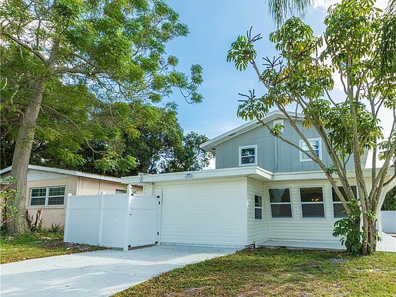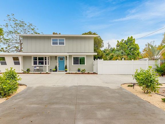 One or more photo(s) has been virtually staged. Live the Florida lifestyle in this two story Arlington Park home waiting for you to entertain your family and friends in coastal style. This 1950's four bedrooms four bath home has been fully renovated with custom modern details while maintaining its classic design. This spacious home creates a beachy feel with board and batton siding, craftsman columns, custom crown molding around impact windows and doors. New plumbing, electrical, air conditioning units and wood vinyl plank flooring were installed making this feel like a brand new home. Upon entering the home you notice coastal elements like shiplap walls, beach planked staircase railings and crown moldings throughout. The cozy living room barn doors adds a pop of blue leading to the bright separate dining room full of windows. The modern slanted windows maintain the original design while a coffered ceiling was added for the perfect balance. Off the living room the upscale kitchen-includes new cabinets with crown molding extending to the ceiling, eat in kitchen, pantry closet, quartz countertops, gold sconce lighting, custom shelving, double sinks, modern gold faucet, high-end LG appliances , electric range, dishwasher, door in door refrigerator. The first floor also features two bedrooms, family den, new bathrooms with modern cabinetry, fixtures, porcelain tile, laundry room with washer/dryer with sink. Upstairs you will find consistent detail showcasing two master bedrooms. The master bedroom has a large walk in closet, barn doors and access to a new edgy yet classic bath with shower. The master suite has a custom built closet, barn doors, ensuite with double vanity, custom cabinets, quartz tops, separate built in vanity for seating, classic schoolhouse lighting and large shower with wall of marble traditional brick pattern. Outside you will find your oasis in this private fenced in yard with tropical landscaping and lighting surrounding the premises. Two outdoor parking spaces can hold 6 vehicles or more. Pool plans available to buyer for 20ft Pool as seen in virtual drawing. Don't miss this one of a kind property schedule a viewing today! Arlington Park has so much to offer walk or ride your bike to Michael's on East, Starbucks, Arlington Park & Aquatic Complex with 50 meter lap pool, playground, dog park, basketball court, tennis court, and walking trail. Or take a short drive to Southside Village shops, restaurants, and gourmet markets, downtown Sarasota, St. Armands Circle, and Siesta Keys Beach.