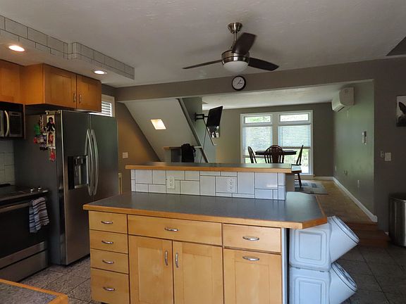 Updated multi level contemporary with a oversized deck, great for entertaining. Large entryway with storage and direct garage entry, open kitchen has a center island and is open to the dining area, First floor bedroom with full bath, living room area with pellet stove has slider to the back yard,first floor laundry and 2 generous bedrooms on the second floor. access to the full back deck from the kitchen for BBqs and level backyard for summer nights and smores.