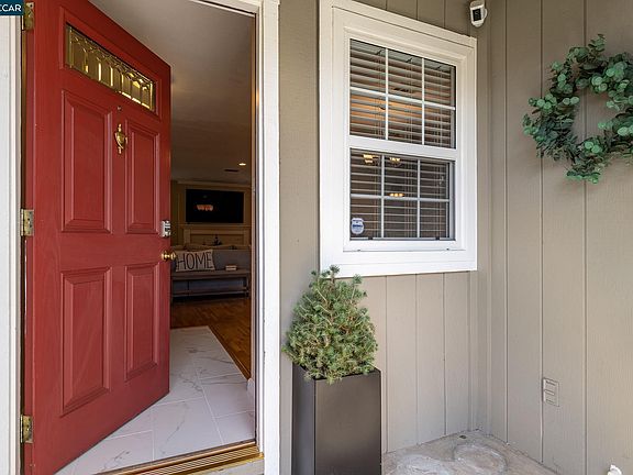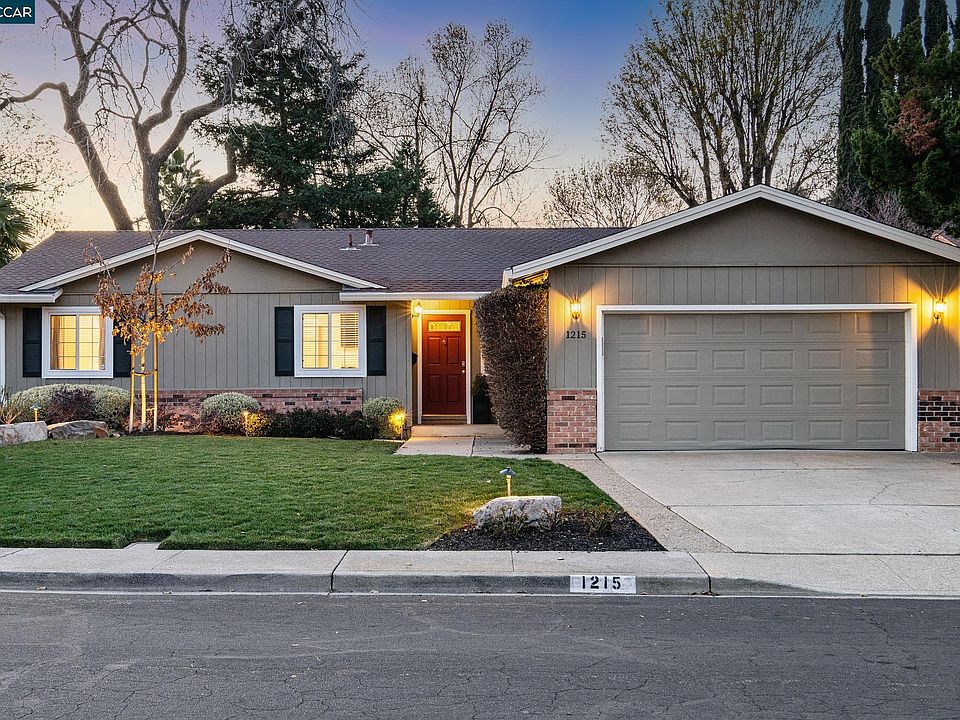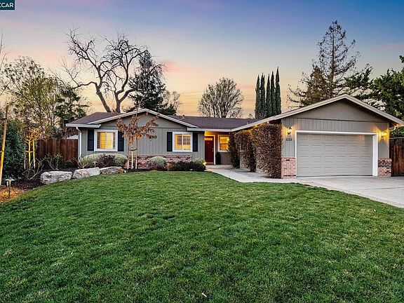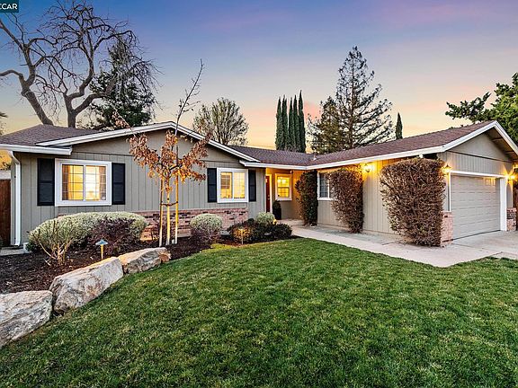 This charming single story home draws you in with its professionally landscaped front yard with custom rock features and up lighting. Once inside, it boasts hardwood floors throughout the main living areas. Large dining area opens to the sunny living room with white framed fireplace flanked by two large windows which bring natural light into the home. Updated kitchen offers white cabinets, subway tile backsplash, black stone countertops, stainless steel appliances, recessed lighting and eat in breakfast bar while perfectly located next to the family room offering access to the backyard. Spacious primary retreat includes walk in closet, plush carpeting and ensuite bathroom with double sinks, granite countertops and oversized shower over sunken tub. Hallway bathroom offers tiled floors, granite countertops and shower over tub. Backyard features patio ideal for entertaining along with large grass area and mature trees. Sizable side yard with gate offers raised vegetable bed and endless possibilities. Ideally located close to Trails, Shopping, Bart and Freeway access. Welcome home.