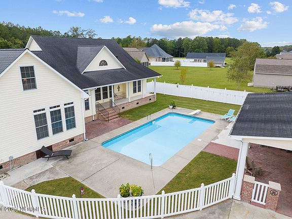 Embark on a journey of Southern elegance meets modern comfort,where surprises await in every corner. Situated on an expansive 2 acres, at the end of a cul-de-sac, this home is a sanctuary for those seeking an easy lifestyle. As you approach, the sprawling driveway beckons and the rocking chair front porch extends a warm welcome, inviting you to step into a world where cherished moments and vibrant memories await.Beyond the threshold, you'll be embraced by the warmth of modern tile, rich bamboo flooring and vaulted ceilings, setting the stage for a living experience that whispers, 'This is where you belong.' The formal dining room exudes an air of elegance, yet, comfort, inviting cherished gatherings and creating memories to be treasured. Continuing onward, the family room unveils its splendor, featuring a vaulted ceiling that reaches for the heavens, a picturesque fireplace, and an expansive array of windows that frame the glorious view of your private, sun-kissed paradise - a shimmering in-ground pool that promises moments of blissful relaxation and playful fun.Now, let's venture into the heart of the home - the capacious kitchen, adorned with tastefully updated backsplash and impressive granite countertops. With an abundance of cabinets and a large pantry, you'll have plenty of room for your favorite cookware. The bar seating is perfect for spectators as you prepare dinner for family and friends, all the while enjoying the seamless flow of conversation in this open, inviting space. Convenient to the kitchen, you'll find the powder room, as well as the laundry room which includes cabinetry and a handy folding table.Just around the corner, you'll step into the primary ensuite—a spacious sanctuary where you can find the privacy you need to recharge for tomorrow. This retreat includes the primary bedroom and bath, featuring two large walk-in closets.The ensuite bathroom is complete with a garden tub, a walk-in shower, dual sinks and an additional separate vanity.And what a view! The family room, breakfast area, kitchen, primary bedroom, and second bedroom all offer a perfect panorama of the pool and patio, ensuring that every moment spent here is inspired with a sense of tranquility and beauty.The split floor plan offers two guest rooms along with an adjacent bath. Upstairs, you'll discover an incredible flex roomlarge enough to let your imagination run wild. It could be a playroom for the kids, an entertainment room for your teenagers, or perhaps even both. Additionally, there's a full bath and a walk-in "attic" that wraps around, providing ample storage space for, well... everything you may need.An adjacent back covered porch is the perfect spot for enjoying morning coffee while birdwatching or checking emails. In the evenings, enjoy appetizers and your favorite cocktail under the covered patio of the pool house while watching the spectacular sunsets of Eastern NC. And when the evening chill sets in, take the party right inside. The pool house includes a full kitchen, open sitting and dining area, along with a convenient half bath. Upstairs is a finished blank canvas for you to make your own. And if all of this isn't enough, there's a newly added covered area off the back to house your ATV.But wait, there's more! Another workshop, greenhouse and chicken coop are just across the way. This vast property offers opportunities to further personalize your surroundings, from a vegetable garden to a playground for the kids. Easy drive to the Outer Banks, Crystal Coast and Raleigh and a short commute to Greenville. This is not just a home; it's a canvas which you'll paint memories. Welcome to your forever oasis.