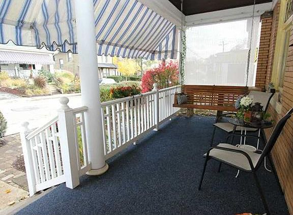Great location for this pretty all brick home close to shops and transportation. Refinished hardwood floors. Updated kitchen and bath. Beautiful stained glass windows and woodwork. Den area on 1st floor. Extra bedroom on 2nd floor is walk in closet. Large 3rd floor bedroom. Lower level has a finished room and a commode. High efficiency A/C units throughout home. Great front porch with awnings. Lovely awning covered deck. Fenced back yard! Gingerbread house!