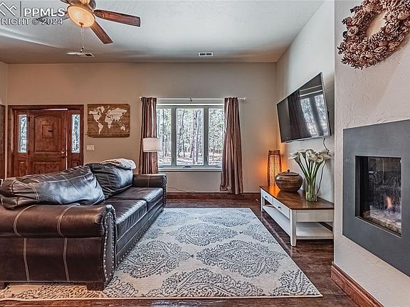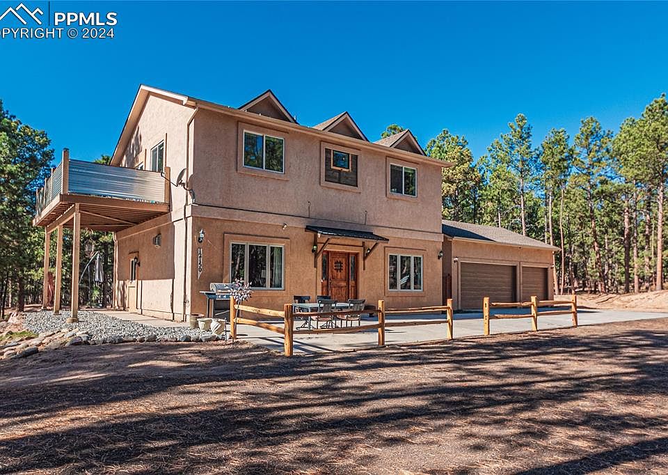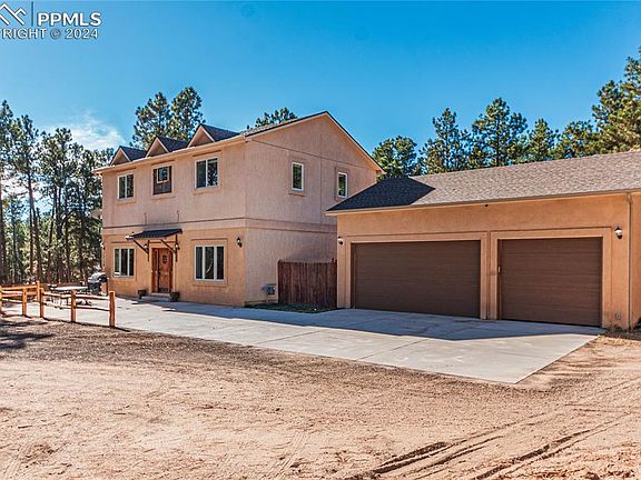 LOCATION,LOCATION,LOCATION Charming 3-Bed, 3-Bath Home in Black Forest. Rare Opportunity in Prime close-in Location, Black Forest Regional Park just down the street. Nestled in the heart of Black Forest, this hidden gem is on a serene cul-de-sac, Surrounded by hundreds of mature ponderosa pines on over 5 acres offering unparalleled tranquility and natural beauty. On the property is a large 32x60' STORAGE BARN and a 21x32' carport. Entering the home the main level Features 10+foot ceilings, living area with cute fireplace, kitchen with custom cabinetry and SOLID GRANITE counters, and a luxurious master suite complete with a Newly REMODELLED ensuite bathroom w/dual vanities and dual shower heads and soaking tub with multiple closets. The Upper Level Boasts vaulted ceilings, an additional complete kitchen with SOLID GRANITE counters, another PRIMARY bedroom with REMODELLED ensuite bathroom, and another bedroom, bathroom and spacious family rm. Enjoy the view from the deck overlooking the expansive, tree-filled property. Outdoor spaces include a large front patio for all your family gatherings as well as a flagstone patio in the back. The Detached 3-car garage has 13-foot ceilings and a VEHICLE LIFT, plus a pass through garage bay convenient for pulling a boat through. This home underwent a significant update in 2023, including a NEW ROOF, ensuring modern comfort and durability. Don't miss out on this rare opportunity to own a piece of paradise in Black Forest! Convenient to Interquest parkway and I-25, Powers corridor, restaurants, shopping and hospitals