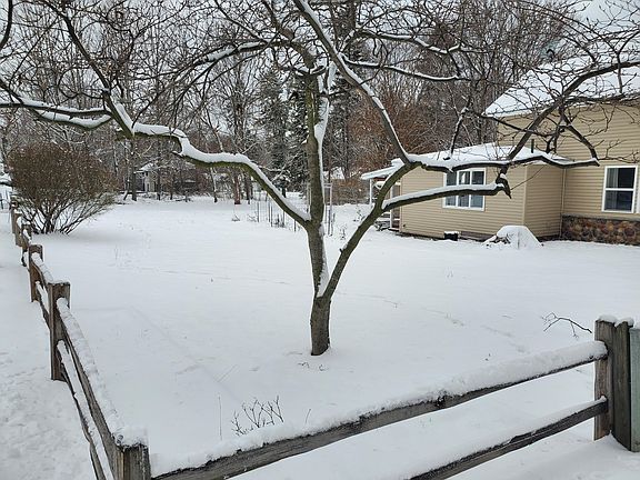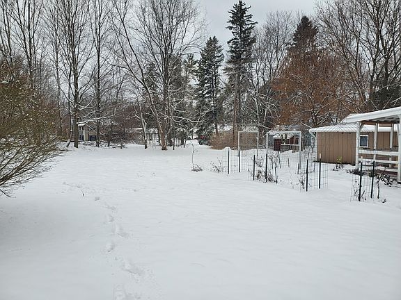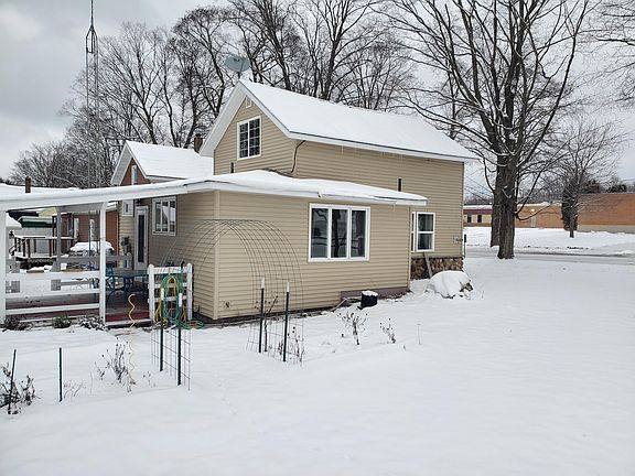Country farmhouse charm in the quiet Village of Bear Lake offers three bedrooms with main floor living and a cozy warm pellet stove in the living room. Dining area has a built in Bookcase. Primary bedroom and bath also on main floor. Laundry is located off the kitchen with access to a large covered porch overlooking the backyard and garden area.