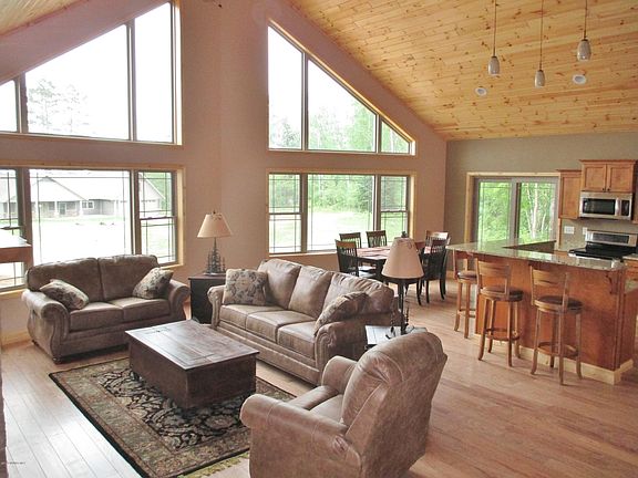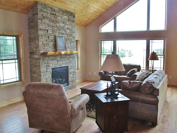 New 4BR/3BA home with harbor on Big Wolf Lake. Stunning view of lake from vaulted great room with stone gas fireplace. Loft overlooking superbly crafted open floor plan great room, dining room & granite counter top kitchen. Main floor master suite with separate tiled shower & spa tub along with 2 walk-in closets. 2 additional bedrooms & full bath on main. Upper level bedroom, 1/2 bath & office space with tremendous views. 28X30 dbl att garage. Ownership includes boat slip in fabulous private harbor, sand beach, & 7 acres common recreation area.