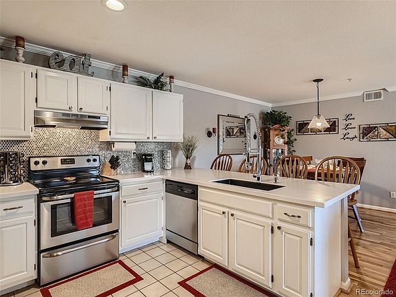 Welcome to this beautiful Littleton condo with mountain views and is FHA approved! Upon entering this gorgeous condo you are greeted with an open floorplan, hardwood floors, crown molding throughout and a comforting family room. This home offers 2 bedrooms (located on opposite ends of unit) 2 full bathrooms and an open kitchen with stainless appliances, beautiful backsplash, extended Corian counters for additional seating and a built in wine rack! Enjoy cozy nights watching tv next to the gas fireplace or warm evenings on the balcony with lovely mountain views. The spacious balcony offers a utility closet for additional storage, and can be accessed from both bedrooms and family room. The community includes pool, spa/hot tub, fitness room, and clubhouse. You can't beat the location of this home. Located near parks, trails, reservoirs, lakes, shopping, and more! Whether your headed to the city or Colorado's gorgeous mountains you have easy access to highways. Don't miss this opportunity.