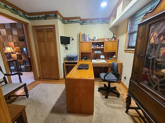 - Features: Counter Bar, Eat-in Kitchen, Kitchen Island, Solid Surface Ctr, Walkout, Wood Cabinets