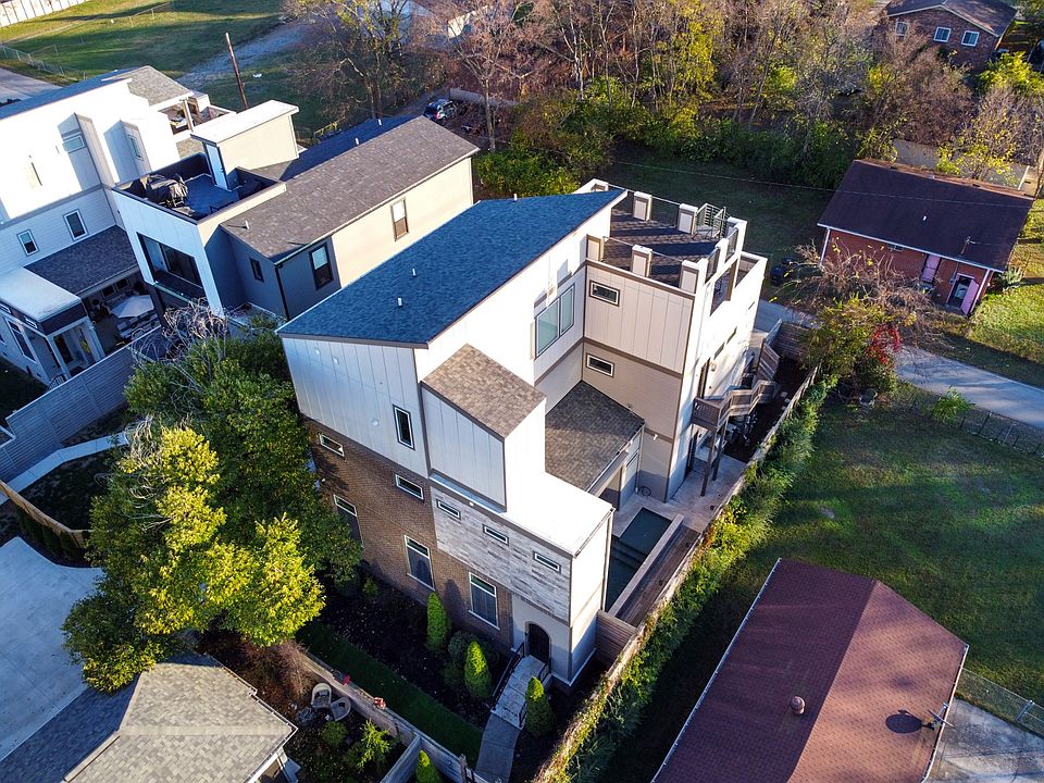 Modern elegance in an unbeatable location! Walk to the Gulch/Music Row/12 South. Extensive outdoor living & entertaining spaces w/skyline views from 3 seperate rooftop decks ~ 2 new turf lounge areas. Luxurious gunite pool w/travertine decking and waterfall feature. 3 covered patio areas w/wood beamed ceilings ~ Lynx built-in grill. Premium finishes abound ~ sleek wide plank floors, designer lighting, custom cabinetry, 2 AccusStone fireplaces, whole house audio, tankless water heater, 3 car garage! Elevator to all floors makes for easy living. Gourmet kitchen w/Wolf 6 burner gas stove, double ovens, quartz counters, striking built-in china cabinet. Butler's area w/dual subzero wine coolers, fridge, ice maker. Gorgeous primary suite w/dramatic sloped ceilings & wood accent beams, fireplace, INCREDIBLE bathroom, huge closet w/custom built ins & extra w/d hookup. Spacious guest suite w/bar & private entrance. Spectacular city views! All furniture & artwork negotiable.