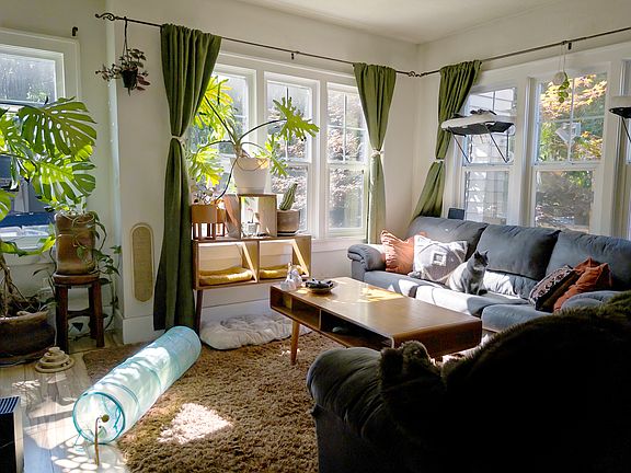 This fully furnished SE Portland home (& room) offers a welcoming mix of comfort, style, and functionality. The interior features warm natural lighting, mid-century and bohemian-inspired decor, lush houseplants, and cozy textures throughout. The main living room includes a large sectional, smart TV, and a fireplace with modern rustic accents. Adjacent is a sunny dining area and a fully equipped kitchen with all major appliances. Tenant will have a cupboard available to them as well as additional pantry space in the basement. The room for rent includes a bed, night stand, dresser, smart TV, shoe rack, a standalone clothing rack and deep set closet to store clothes and whatever else. This house is also inhabited by two furry little gentlemen by the names of Bruce & Buster. They are not allowed in the guest room and there is an air filter on at all times on the main floor to cut down on any allergens. Ideally I would like a 6mo commitment, but am open to something shorter if it's the right fit.