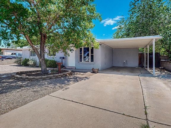 Discover this charming two-bedroom, one-bath gem boasting a stunning kitchen with granite countertops, a stylish tile backsplash, and stainless steel appliances (fridge included). Enjoy the updated bathroom and sleek laminate flooring. The spacious great room features Pergo Maxx laminate flooring, a cozy wood-burning stove with a slate porcelain tile surround, and flows seamlessly into the dining area. Updated windows/lots of natural light. The expansive backyard offers a large covered patio, custom10x10 shed with attic storage, additional work shed and a delightful fenced garden with raised beds with drip system ideal for any gardener to grow veggies. Conveniently located just 5 minutes to Uptown, 10-15 minutes to KAFB, and easy access to I-40. This well cared for home is selling as- is.