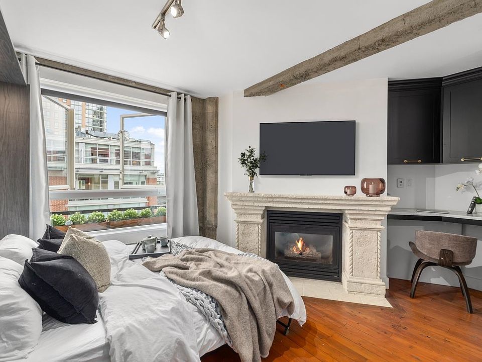 The Murchies Building, one of Yaletown's most coveted heritage loft conversions. This stylish studio boasts 9" ceilings, reclaimed fir floors, exposed concrete beams, and a beautiful Suquet stone fireplace. Modern upgrades include a sleek kitchen with quartz counters and SS appliances, custom built-in murphy bed, plus a beautifully designed bathroom with ample storage. Experience vibrant Yaletown living with top restaurants, boutique shops, the marina and seawall just steps away. Easy access to the Canada Line Skytrain and car share options. The building offers a stunning common rooftop-patio with city and garden views, perfect for BBQs and entertaining. Additional conveniences include in-suite laundry and a large external storage room. Embrace urban living at its finest!