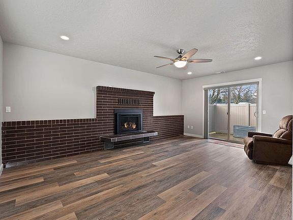 - Description: Brick fireplace, Sliding glass door, Laminate wood