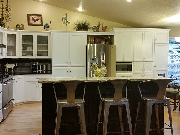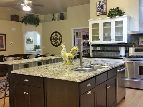 Beautifully updated single level home on 1+ acre minutes from freeway access and shopping . Main home is 3 bedroom 3 bath. Gorgeous kitchen with beautiful granite countertop on a large island with bar. All stainless steel appliances. Gourmet gas range with double oven. Kitchen and family room is 25 X 18 and a wonderful cooking and entertaining area. Large 16 X 15 bonus room. Master bedroom is 16 X 14. Second bedroom is 14 X 11 with private bath. Third bedroom is 11 X 11. Office is 11 X 11. Wood floors and lots of beautiful tile. Two year old gas furnace, gas water heater, electric heat pump and shingles on roof. Large 3 car attached garage. Approximately 1/3 acre irrigated pasture. Large fenced garden area with potting / garden shed and sink. Separate mother-in-law home has full kitchen including dishwasher and electric range, living room and 1 bed and 1 bath. Relaxing outdoor area...listen to the stream and watch fish swim and the birds play. Great location!! MUST SEE!!