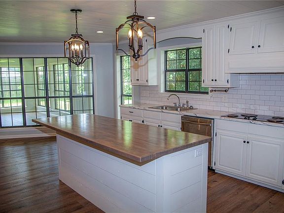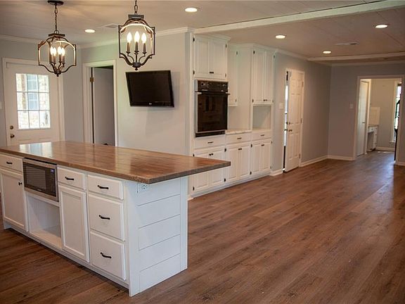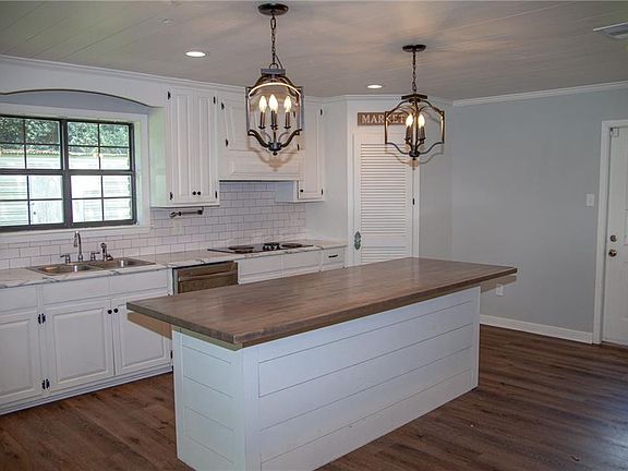 This 3 bedroom, 2 bath home has a bonus room that could be a 4th bedroom, as well as an office, a sunroom, dining room/living room combination, and an extra shed out back. The kitchen is updated with an island topped with a gorgeous butcher block countertop, new flooring, white cabinets, space for a coffee bar, and updated light fixtures. The house has been repainted inside and has new vinyl plank flooring throughout living areas.