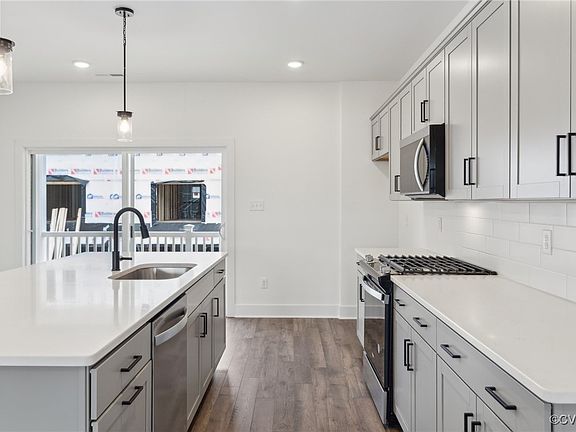 Welcome to the Richmond "A" by Main Street Homes! This Energy Advantage Plus 3 story END UNIT townhome offers 3 bedrooms, 3.5 baths, oak stairs from 1st to 2nd level, rear entry 2-car garage, tankless water heater, rear covered deck, Hardie-plank siding, and a first and second-floor front columned porches. The first floor includes a bedroom with laminate flooring, a full bathroom, and a coat closet. The second-floor open concept offers a large great room, dining room, powder room, pantry, and a rear kitchen layout complete with quartz countertops, ceramic tile backsplash, stainless steel appliances, a large island, and gas stovetop. The third floor includes a primary bedroom suite with 2 walk-in closets, an ensuite bathroom with a large Euro shower, linen closet, double bowl vanity, a guest suite with a walk-in closet and full bathroom, and a laundry room. Shire Walk amenities include sidewalks and benches throughout the community, gathering space with a pergola and fire pit, and green open spaces to relax and socialize. This low-maintenance community in Henrico County is conveniently located close to dining, shopping, and entertainment at Short Pump Town Center and the surrounding area.