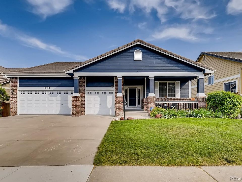 Beautiful giant ranch home 3 bed/3 bath/3-car plus an office on the Cul-de-Sac! Enter off your large sitting porch onto the real hardwood floors of this bright open floorplan. Glass french doors open into the office with custom built-in shelves. Office adjoins a 3/4 bath and may double as a bonus 4th bedroom! Formal dining room with bay window and tray ceiling connects to the spacious dine-in Gourmet kitchen with breakfast bar island. The grantite tile island includes a farm sink with instant hot water faucet under pendant lighting! Gourmet gas cooktop, double oven, upgraded 42" cabinets, lower cabinet roll-outs and all appliances included! A high vaulted roof expands the kitchen and living room which offers a warm gas fireplace. Master bedroom offers two large walk-in closets, sits under a vaulted ceiling with fan and the 5 piece bath includes a brand new frameless glass shower! Two healthy sized additional bedrooms share a full bath. The laundry room offers a large utility sink, overhead cabinets and the washer & dryer stay. Build your dream in the unfinished walk-out basement...bed and bath framed with a rough-in! The dine-in kitchen steps onto a huge 10x26 Trex deck offering amazing panoramic views and a circular staircase to the lower entertainment patio! And the Southern exposure won't bother you with the Brand New Powered Awning with wind sensor (that's right it auto-retracts in high winds)! A Xeriscaped garden makes the rear yard a low maintenance no-mow enjoyment! New exterior paint in 2020! Amazing neighborhood location! Close to light rail stations and freeway. Easy access to Denver Tech Center, Park Meadows Mall, Parker PACE Center, Lone Tree Arts and Entertainment District. Close to Bluffs Park for hiking/biking. Private Meridian Golf Course Nearby. Neighborhood trails. So much more...schedule your private showing now!
