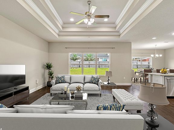 Spanish Fort Schools/Stonebridge Elementary! This IMMACULATE 4 bedroom home is just waiting for you! Functional, open-concept floorplan, has an awesome kitchen. Don't miss the pretty, white cabinets, soft close doors, center island, crown molding, granite counters, stainless steel appliances, subway tile backsplash, and luxury vinyl plank floors throughout, carpet in bedrooms! 9' ceilings, multiple tray ceilings and split bedroom plan make the home feel so spacious. Primary bedroom is large with tray ceilings and ensuite bath. Primary bath has soaking tub, separate shower, enclosed water closet, double vanities, and a MASSIVE closet!! A covered back patio overlooks a manicured backyard with a privacy fence with drive gate and walk gate. Home is fortified for lower insurance rates! Also has double garage, dimensional shingles and hurricane protection fabric panels. Property may be eligible for USDA loan to a qualified buyer. Some photos are virtually staged.