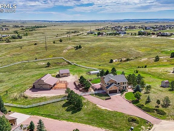 Welcome to your dream equestrian paradise! This exceptional property offers the perfect blend of rural tranquility & modern convenience. Set against the breathtaking backdrop of the Rocky Mountains, you'll enjoy stunning 360-degree views, from the majestic Pikes Peak & the Front Range to the serene eastern plains. Equestrian enthusiasts will appreciate the well-maintained 4-stall barn, sized 36x40, with two 12x12 stalls & two spacious 16x12 foaling/breeding stalls. The barn features a concrete alleyway, a 12x12 heated tack room with hot water & sink, a 14x14 wash room & a 12x40 upstairs storage room. Your horses will thrive in the fenced pastures, ready for them to graze to their heart’s content. The home itself is a perfect blend of comfort & style, offering two stories plus a fully finished basement. Hardwood flooring runs throughout the main level, which includes a spacious living room with two-story ceiling height, separate dining area, eat-in kitchen boasting granite countertops & stainless steel appliances, cozy family room with gas fireplace & a convenient half bath. Upstairs, you'll find three well-sized bedrooms & two full bathrooms, including the private master suite with a luxurious 5-piece bathroom, a walk-in closet & stunning eastern views. The fully finished basement offers another gathering space, laundry facilities, two more bedrooms & an additional full bathroom. Step outside to enjoy picturesque landscaping with mature trees, lush green lawns, colorful flowers & plantings. The large flagstone patio is the perfect spot to soak in the beauty of the outdoors. Additionally, the property includes a spacious 24x24 workshop/studio with water & electric, plus a generous 23x23 greenhouse, ideal for gardening enthusiasts. Zoned for horses & ready for you to make it your own, this true equestrian property is a rare find that combines the best of country living with modern amenities. Don’t miss the chance to make this stunning property your own!