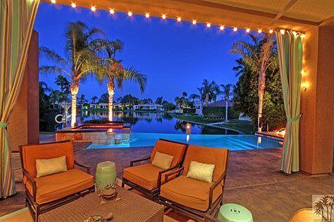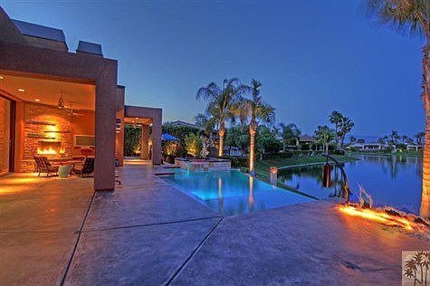 Stunning Lakefront Custom Contemporary in Fairway Estates at Mission Hills Country Club! Featuring Indoor/Outdoor Living at its best with one of a kind high end finishes on .38 acres. Open Great Room w/cut glass fireplace and step down wet bar, dining area with refrigerated wine room, gourmet kitchen with top of line stainless appliances and granite center island - the ultimate entertaining and living space. Master Bedroom Retreat has fireplace, sitting area, light filled bath and private terrace. Media room w/automated drop down 108 HD screen and theater surround sound. Office with dual work stations. Top quality bamboo, polished cooper slate and berber flooring, electric shades, smart wired and solar equipped. Amazing outdoor living - 500 sq. ft. covered outdoor living room with stone fireplace, built-in BBQ and dining area, infinity pool and spa and fire pit. Views of the lake and mountains adjacent to the Arnold Palmer course - Come home to your desert paradise!