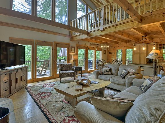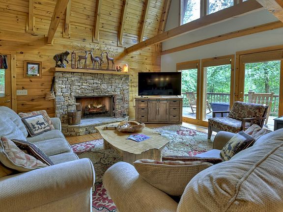 Aska Adventure Area Private Retreat within walking distance of USFS on 3 unrestricted acres! Listen to the sounds of Big Creek from the porches of this 3br/3.5ba cabin w/plenty of space, 2 car basement garage, concrete circular driveway, 2 levels screened porches + additional open porch & large deck complete w/hot tub! Soaring cathedral ceiling w/massive wall of windows for tons of natural light, stone fireplace. Master & laundry on main, spacious updated kitchen w/gas range, beautiful exposed beams throughout, tasteful mix of wood finishes/wood floors. Amazing location in the middle of all the hiking, mountain biking, & trout fishing. Peaceful mountain retreat offering tons of wildlife nestled into the Chattahoochee National Forest! Could have year round Mtn. view w/tree trimming. Fully furnished. Current successful short term rental.