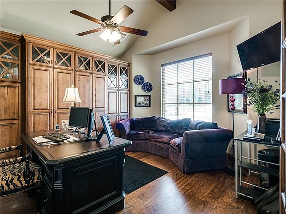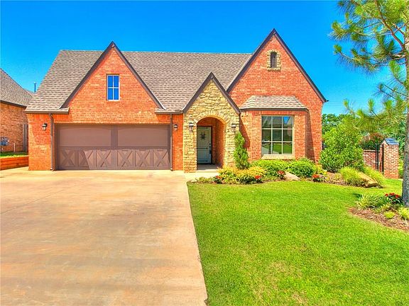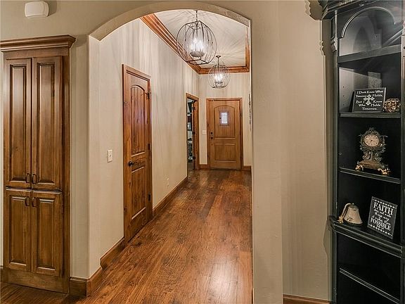 Enchanting w/cottage charm, this bungalow styled home in Edmond's Birnam Woods has attention to detail & quality workmanship. Spacious yet cozy living room highlights a rustic beam, vaulted ceilings,stone fireplace & expansive wall of tall windows for abundant natural light, custom built in hutch & gorgeous hand scraped REAL wood floors. Open kitchen features stunning granite, stainless appliances, gas cook top stove, island/bar area & walk in pantry w/barn door features. Dedicated study has an entire wall of custom built cabinets w/blown glass details. The beautiful master suite continues the continuity of the hand scraped wood floors. Master bath has walk in shower, double vanities w/nice walk in closet. Covered patio w/outdoor kitchen, built in surround sound & wood burning fireplace-perfect for entertaining guests/family. In ground storm shelter, mud room shelving, beautiful established landscaping, Edmond schools, close to shopping & retail. Classic & timeless this is a must see!