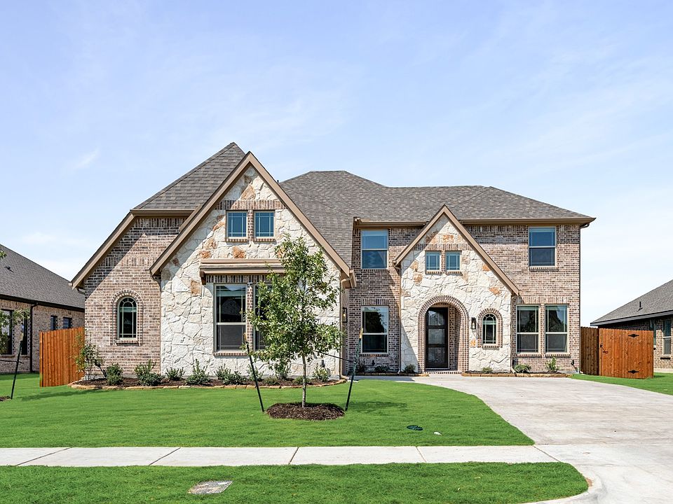 BRAND NEW & NEVER LIVED IN BEFORE! Move-In Ready NOW. Bloomfield Homes' Seaberry floor plan is a stunning two-story home on an interior lot with a stylish J-swing garage and a generously sized yard, offering 5 spacious bedrooms and 4 baths. The open foyer welcomes you with an elegant Formal Dining area and a private Study enclosed by glass French doors, while a glass pantry door and open horizontal railing add subtle sophistication to the design. A Butler’s Pantry provides seamless access to the Deluxe Kitchen—an elevated culinary space featuring upgraded cabinetry, Quartz counters, pot and pan drawers beneath the cooktop, under-cabinet lighting, a pull-out trash bin, and a striking wood vent hood over all-electric stainless steel appliances including a Double Oven. This chef’s dream flows effortlessly into the expansive Family Room, where soaring 18’ vaulted ceilings, picture windows, and a dramatic Stone-to-Ceiling Fireplace with a cedar mantel create a warm yet refined ambiance. Throughout the downstairs, upgraded Tile floors extend across all common areas, enhanced by upgraded carpet in the bedrooms for added comfort. The Primary Suite is a serene retreat with a drop-in deck mount tub, separate shower, and roomy L-shaped vanity, while thoughtful additions like window coverings, a nearby mud room with added function, and blinds throughout elevate daily living. Upstairs, a spacious Game Room ensures plenty of entertainment space for family and guests. The home’s stately brick and stone façade is further enhanced by cedar garage doors, a bricked front porch, and an 8' custom front door, while double flood lights, uplights, full gutters, and exterior lighting add curb appeal and security. A 10x17 extended patio completes this exceptional design, combining luxury, comfort, and functionality in perfect harmony. Call or visit today!