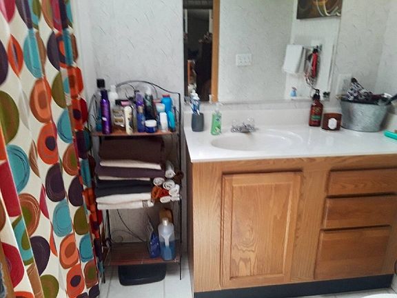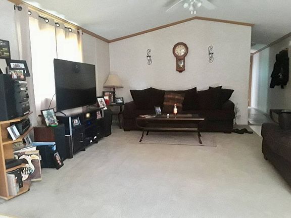 Enter into an extra large living room with off white walls, dark tan carpet. This opens into the dining area. It has room for a large table and built in hutch. Kitchen: Vinyl tile flooring, off white walls, light oak cabinets, sky light. Range, refrigerator, microwave and dishwasher all stay. Master Bedroom: Nice sized room, walk-in closet, off white walls, and dark tan carpet Master Bath: White fixtures, tub and shower combo, oak vanity, vinyl flooring Bedroom (2): Dark tan carpet, off white walls, closet Bedroom (3): Dark tan carpet, off white walls, larger closet Extras: Deck, 1 1/2 stall garage, city water, septic WASHER AND DRYER DO NOT STAY