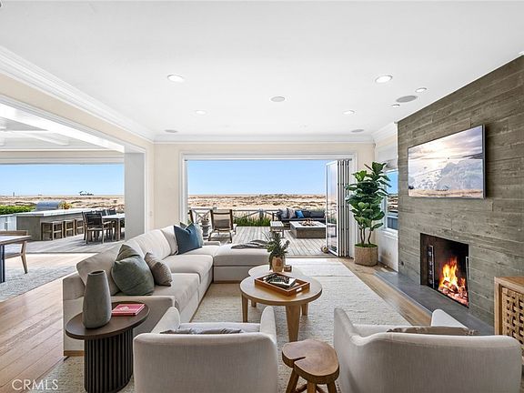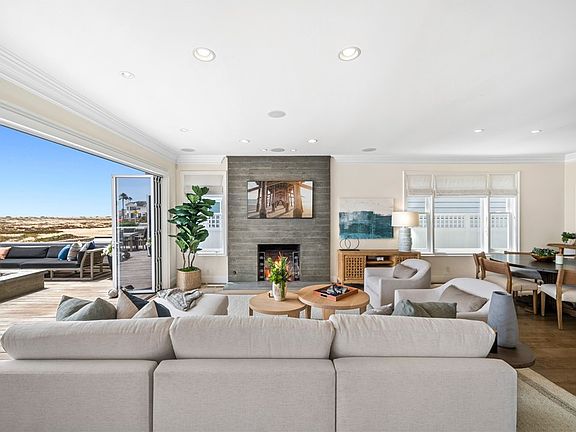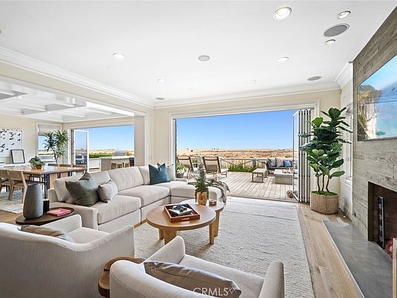 A timeless Hampton’s-inspired beach home set on an enviable 45' wide parcel along the Balboa Peninsula oceanfront strand. Light, bright and abundantly spacious interiors convey a sophisticated, beach-chic style that comes across as effortless and calming. The stunning open concept floor plan was designed specifically for friends and family to gather and enjoy the generously scaled indoor and outdoor living spaces. Walls of glass disappear opening onto an impressive outdoor living room, complete with a built-in barbeque/kitchen area, and cozy beach front fire pit. The oceanfront great room and adjoining dining area open to the professional-grade kitchen complimented by gleaming stainless-steel appliances, honed stone counters, custom lighting, a butcher-block service island, and walk-in pantry. The adjacent media room, powder bath, and laundry area complete the first-floor accommodations. The second level living spaces are thoughtfully considered with four generously proportioned bedroom suites. The sunny, welcoming environs of the primary suite provide panoramic coastline views from the world-famous Wedge to Catalina Island and spectacular over-water sunsets. Dramatic, vaulted ceilings, dual his and hers baths and dressing areas, and a connecting sitting room with an oceanfront terrace complete the primary retreat. A rare commodity at the beach, the home also boasts an oversized three car garage with attic storage above and three adjacent outdoor parking spots. An exceptional floor plan, conveyed with an on-point seaside aesthetic are the attributes of this classic Newport Beach oceanfront home. *Possible Seller Finance Option Potential For Qualified Buyer. Call For Details.