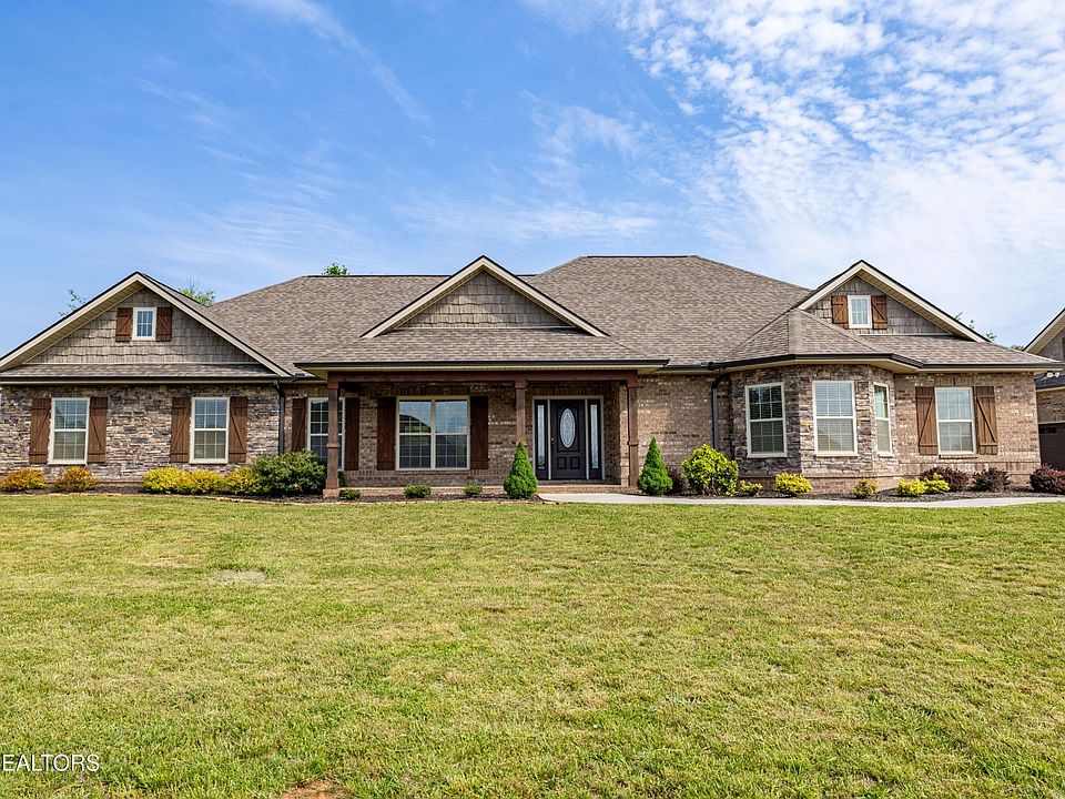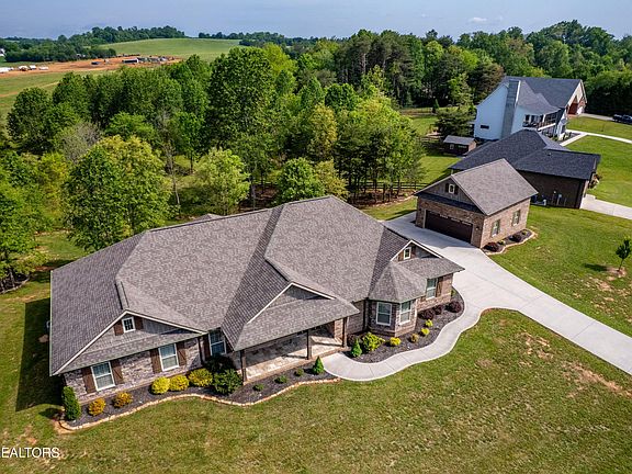 Welcome to a truly special East Tennessee home in one of Greenback's most desirable neighborhoods, Wyndsong. This beautifully maintained, single-level ranch offers comfort, convenience, and some gorgeous mountain views all in one thoughtfully designed home. This one-owner home sits on a spacious 1.16-acre lot, offering both privacy and functionality with a thoughtful layout and a host of practical amenities (including an incredible detached garage). You're greeted by a spacious front porch—an ideal spot for soaking in the picturesque mountain views. Step inside, and you'll discover an open-concept floor plan that connects the family room, dining area, and kitchen in a way that makes entertaining or simply enjoying everyday life a breeze. The family room sets the stage with a cozy gas fireplace and trey ceiling, creating a warm and inviting atmosphere. The kitchen is both stylish and practical, featuring granite countertops, a large island for prep and gathering, a walk-in pantry, and a beautiful tile backsplash. A window above the sink provides a tranquil view of the backyard so you can enjoy your surroundings even while doing the dishes. Just off the kitchen, the dining area is flooded with natural light—perfect for casual meals and morning routines. The spacious primary bedroom ensuite is a true retreat with a well-sized walk-in closet, dual vanities, and a beautifully designed tile shower. Two additional bedrooms share a full bath conveniently located between them. One of these rooms has been converted into an impressive theater room, complete with built-in features for film enthusiasts. Of course, if movies aren't your thing, you can easily transform this space back into a bedroom, home office, or hobby room. The laundry and mudroom just off the attached two-car garage adds day-to-day convenience. If a 2 car garage isn't enough, vehicle enthusiasts and tinkerers alike will be pleased with the additional detached garage that's more of a workshop haven than just a