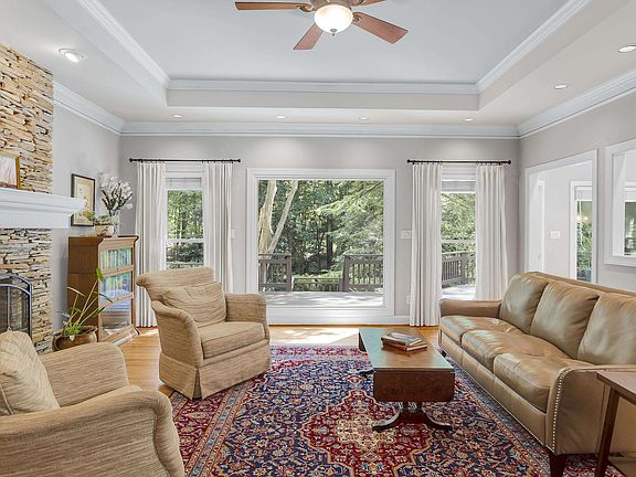 Discover a spacious and serene retreat in North Raleigh's River Oaks neighborhood. This 4 Bed/4.5 bath home showcases forest views and laid-back elegance. A stacked stone fireplace and picture windows give the living room the cozy ambiance you would expect from a luxury resort. The renovated kitchen opens to a huge wrap-around deck perfect for outdoor entertainment. The first floor features a spacious primary suite with a two-sided fireplace, elegant en suite bath, and private screened-in porch. Upstairs offers three bedrooms, an office, and a flex space with a wet bar. Don’t miss the massive bonus room with full bath and private entrance. Outside, the 1.88-acre lot features a large, flat yard surrounded by mature forest. You’ll even find a charming creek with storybook bridges. Nature enthusiasts can access Falls Lake or Annie Louise Wilkerson Preserve directly from the neighborhood, or enjoy the HOA-provided clubhouse, pool, pickleball and tennis courts. Don't miss this opportunity to experience luxury in a natural setting.