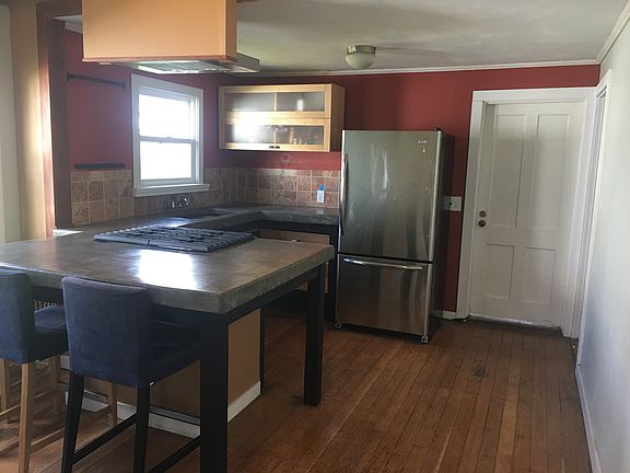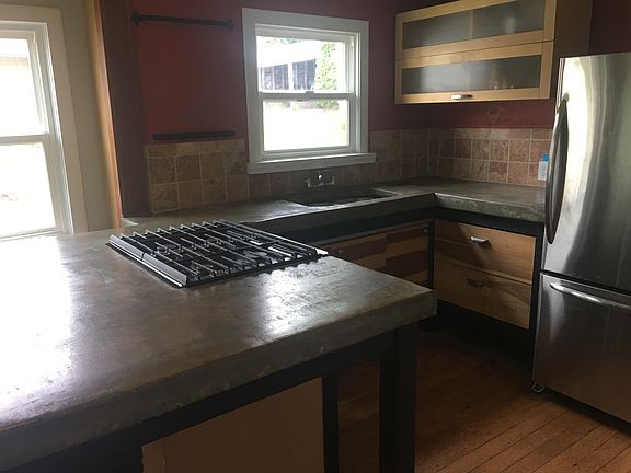 Modern kitchen with custom concrete countertop and inset gas stove/oven, modern fridge and garbage disposal.