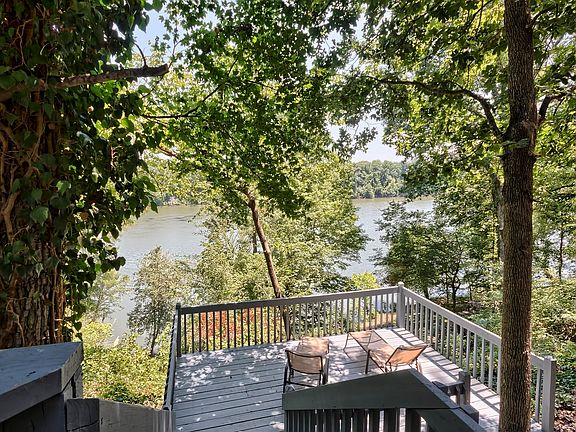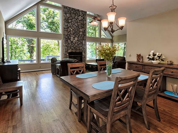 Property fronts and overlooks the Broad River with exceptional views in both directions. Extensive decking.3.45 acres of towering hardwoods and natural beauty. Steps down to river and water front deck. Small dock for launching boats. Two story great room with glass wall of river views. Stone woodburning fireplace. Basement offers full bath, big game room, or additional bedroom and double garage. Small fenced area for pets.